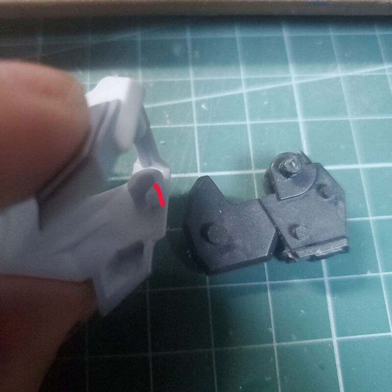 赤い線の部分までカットしてもハメる時はかなり難しいので、挑戦する人は塗装前の仮組の段階で必ずチェックした方が良いと思います。